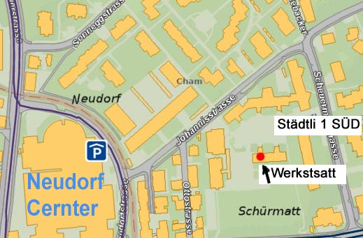 (Wegweiser: Am Teuflibach) Navigations-Gerät, 6330 Cham, Lorzenparkstrasse 6,   nach 30m rechts abbiegen, auf dem Kiesweg 50m, dann 1. Abzweigung links abbiegen noch 500m.